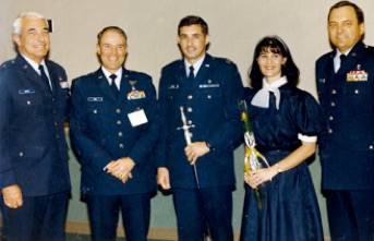 Dr. Medley, center, is flanked by, from left, Surgeon General Brig. Gen. Donald Butts; Joint Military Medical Commander Maj. Gen. T. P. “Pre” Ball, Jr., wife, Liz, and USAFE Command Dental Surgeon Col. Kenneth I. Knowles, as he receives his sword in recognition of being designated “USAFE Junior Dental Officer of the Year” for all of Europe.